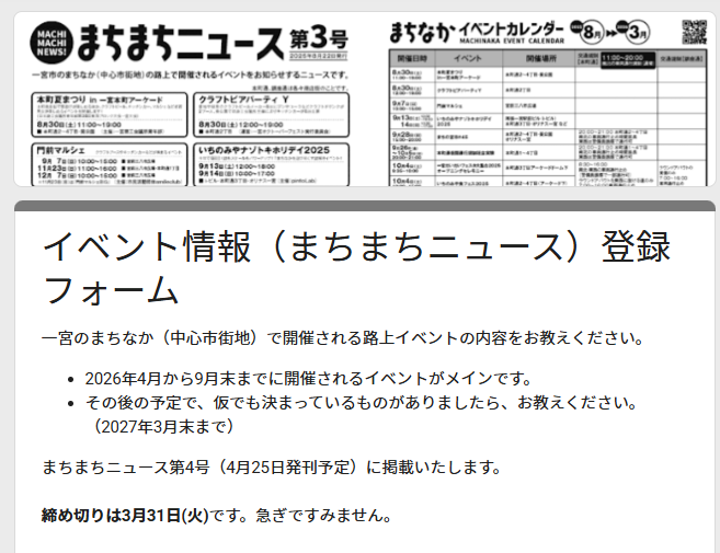 「まちまちニュース」は、一宮市のまちなか(中心市街地)の路上で開催されるイベントをお知らせします。