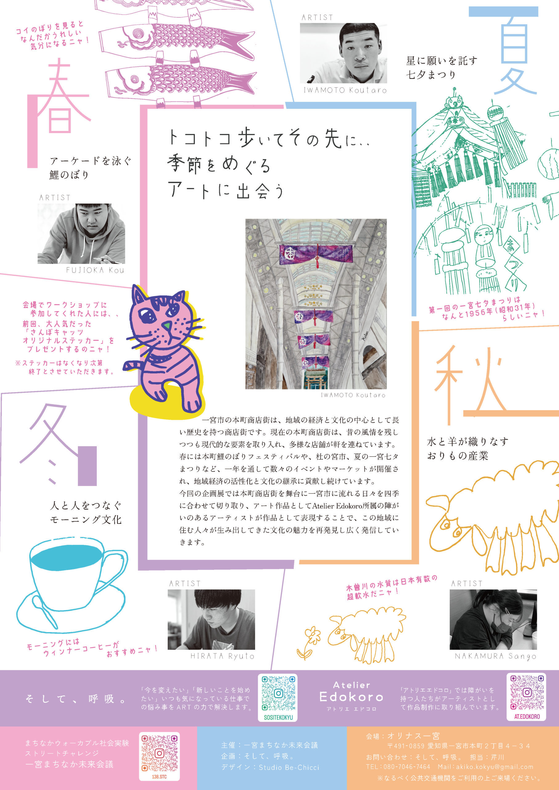 本町商店街を舞台に一宮市に流れる日々を四季に合わせて切り取り、アート作品としてAtelier Edokoro所属の障がいのあるアーティストが作品として表現することで、この地域に住む人々が生み出してきた文化の魅力を再発見し広く発信していきます。